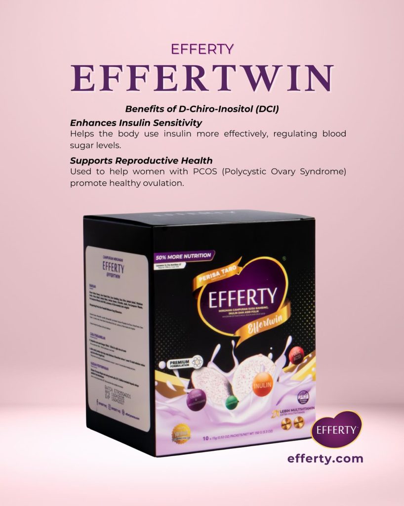 1.Sokongan nutrisi buat yang ada PCOS: Nutrisi dalam Susu Efferty perisa taro sokong kesihatan hormon menggunakan gabungan nutrien Myo-Inositol dan D-Chiro Inositol nisbah 40:1.